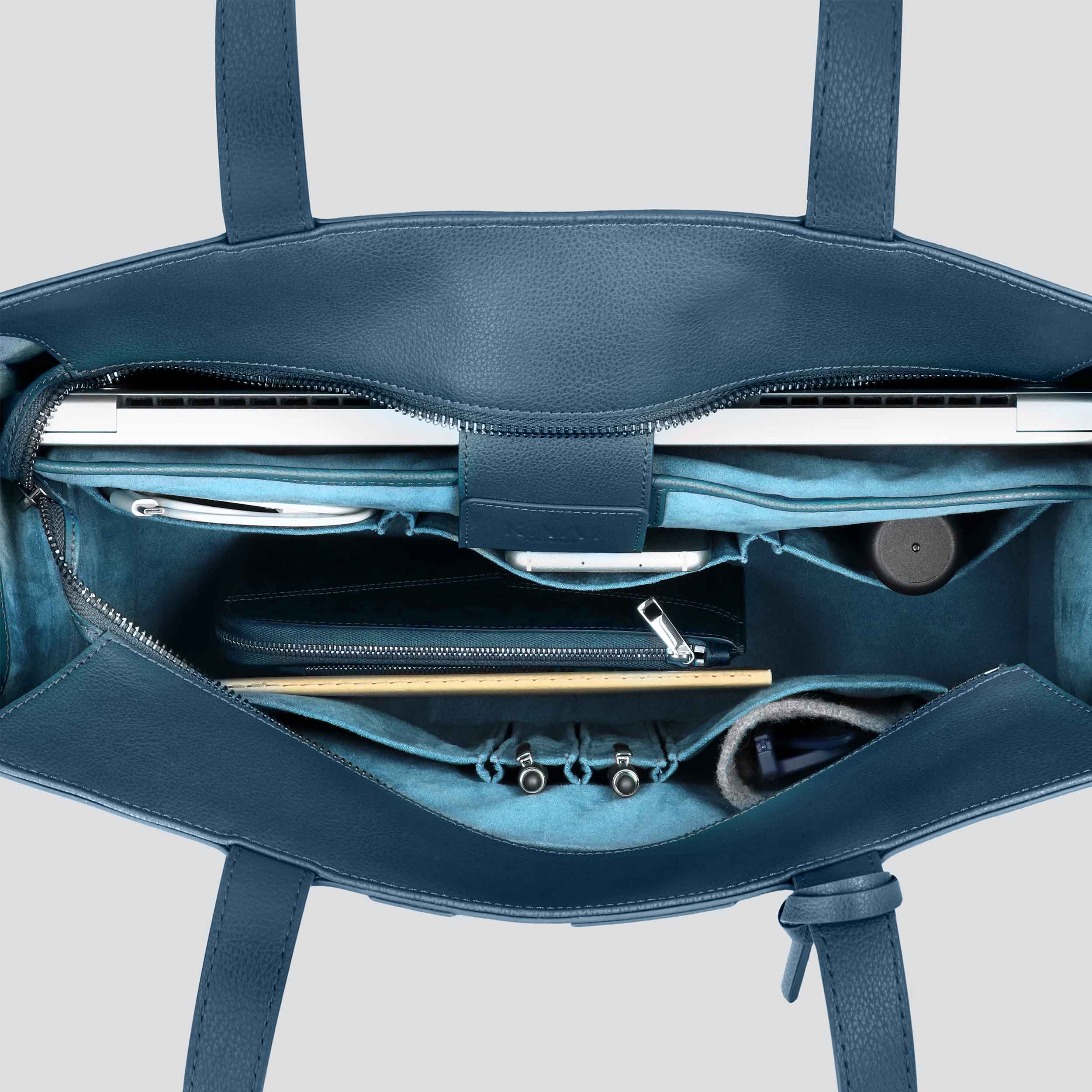 - Has multiple inner pockets to hold your laptop, phone, glasses, charger cables, pens and paper, makeup, water bottle, and more.